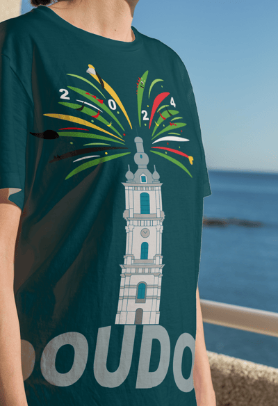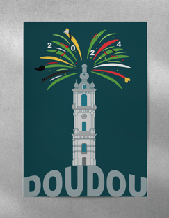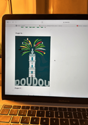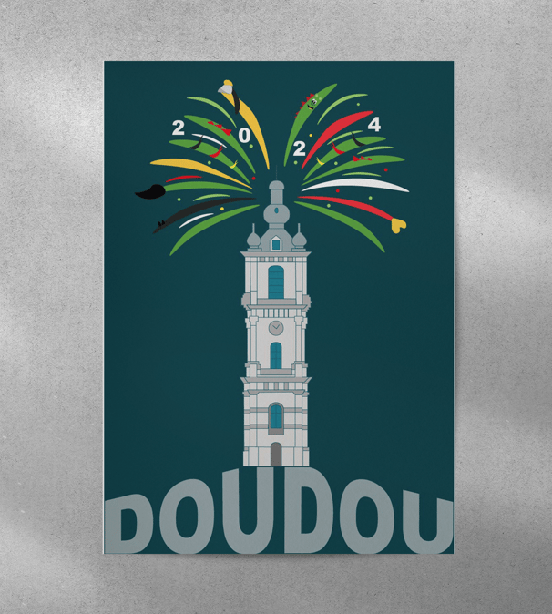 J'ai donc tenté ma chance en créant une affiche pour ce concours. Je me suis inspirée des différents éléments du Doudou, comme le dragon, Saint Georges avec sa lance et son cheval, mais j'ai également été inspirée par l'idée de la célébration, d'où l'ajout d'un feu d'artifice pour illustrer la fête. Et j'ai combiné les deux éléments : j'ai réalisé un feu d'artifice en intégrant tous les éléments du Doudou.