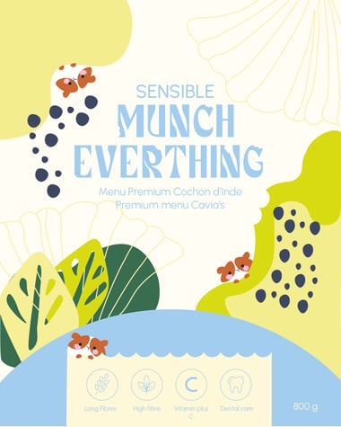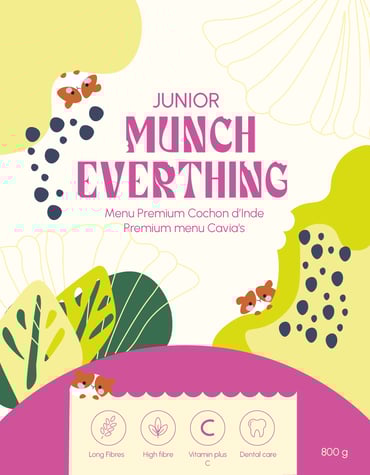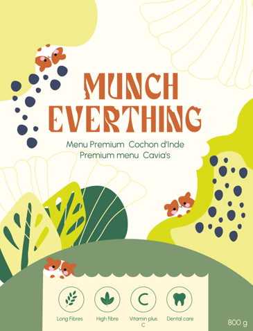 Munch everything est une marque de nourriture pour cochons d'Inde. Le briefing était de concevoir et réaliser un packaging innovant pour de la nourriture destinée aux cochons d’Inde. Il fallait que les créations brisent les codes établis et captivent un public jeune et urbain. L'objectif était de concevoir un emballage qui soit à la fois fonctionnel et esthétique pour la nourriture des cochons d’Inde. Le packaging doit se démarquer sur les étagères des magasins par son originalité et son attrait visuel.